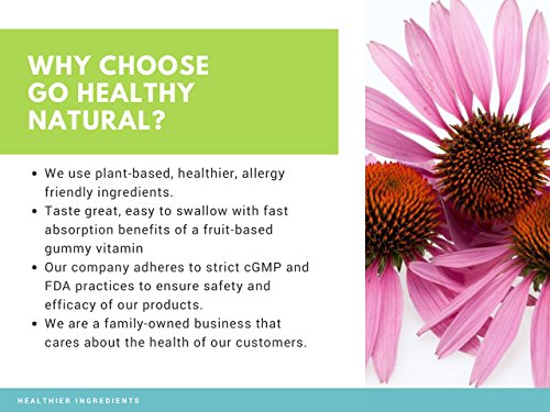 Great Tasting and Easy to Take 100% All-Natural Chewables Helps Support Iron Absorption, Collagen Formation and Immune Health Vitamin C with Echinacea Helps Stimulate the Immune System Daily Serving of 1 Gummy Contain 100 mg of Vitamin C and 5 mg of Echinacea Our 100% Vegetarian and Vegan All-Natural Gummies Are Hand Crafted and Slow Cooked Using Citrus Pectin From Citrus Fruits We Only Use Natural Color (Beta-Carotene) and Natural Flavor (Orange) from Fruits & Vegetables Our Proprietary Slow-Cook Method creates a Gummy That is Softer and More Flavorful Than Other Gummy Vitamins They are Softer Then Gelatin-based Gummies and Don't Stick to Your Teeth Gelatin Free, GMO Free, Gluten Free, Peanut & Nut Tree Free, No Artificial Preservatives, Colors or Flavors, Soy, Eggs, Milk, Yeast, Wheat (Gluten), Fish or Shellfish. Produced in a Nut-Free, Halal, Kosher Kosher Gummy Vitamins & GMP-Certified FacilityFeature