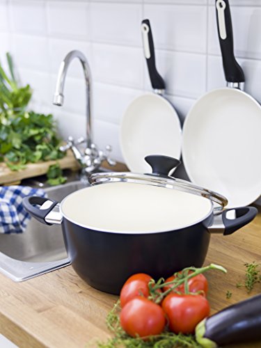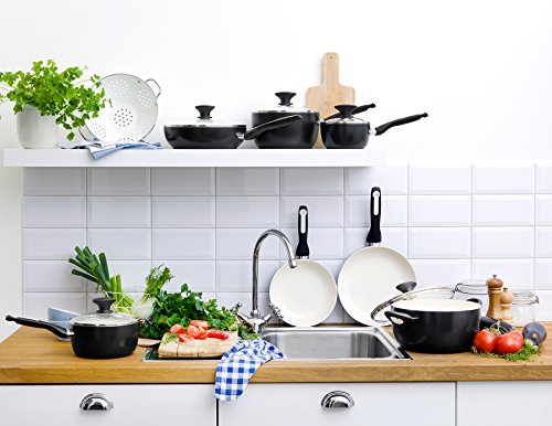 The GreenPan Rio collection brings a touch of color to your kitchen. The 12pc Ceramic Non-Stick Cookware Set in Black is complete with our Thermolon healthy ceramic non-stick coating for an impressively easy release every time you cook. Rio offers you a tasteful mix of optimal heat distribution and 100% cooking and cleaning convenience. After all, GreenPan quality also extends to the details, from the stay-cool Bakelite handle to the heat-retaining base to the oven safe glass lid. Complete with a limited lifetime warranty for worry-free cooking. This set includes: 8” open frypan, 9.5” open frypan, 9.5 covered sautepan, 1qt covered saucepan, 2qt covered saucepan, 3qt covered saucepan, and 5qt covered casserole.Feature