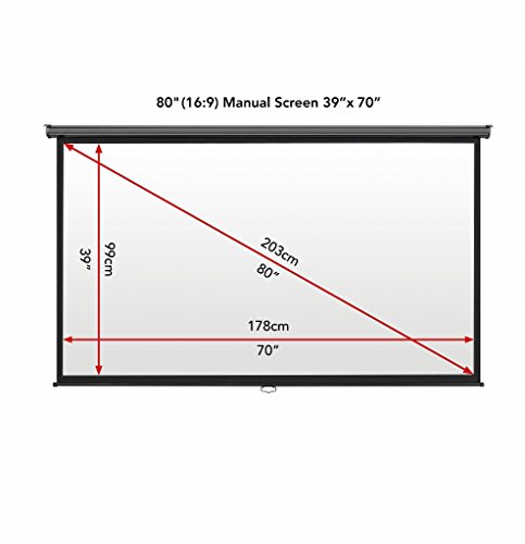 - Feature : Create the perfect Home Theatre Experience or Office Presentation Screen / 80" HDTV Ready Projection Screen - Suitable for Wall or Ceiling Mounting / 16:9 Aspect Ratio / 1.1 Gain Rating for Low light Reflection - Matte White Screen with Black Edging for Improved Contrast Ratio / Viewing Size 39" (H) x 70" (W)
