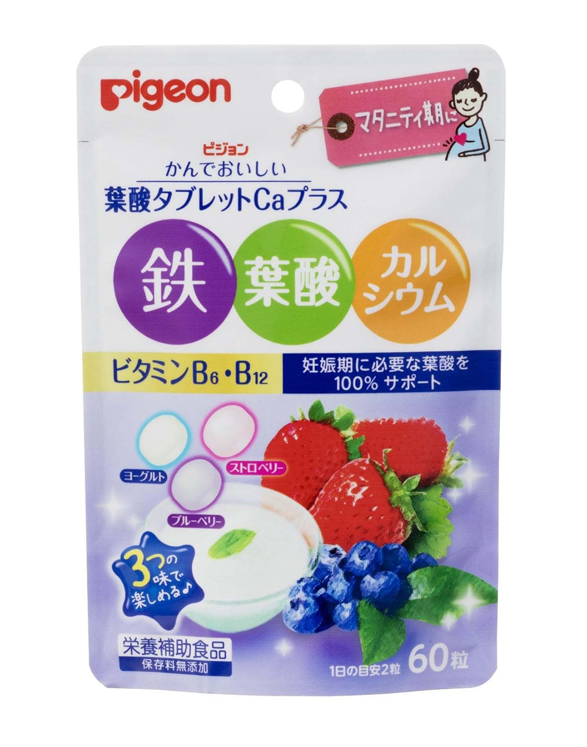 ●1日2粒で葉酸400μg、鉄分10mg、ビタミンB6、ビタミンB12に加え、妊娠期に不足しがちなカルシウムが一度に摂れるサプリメントです。
