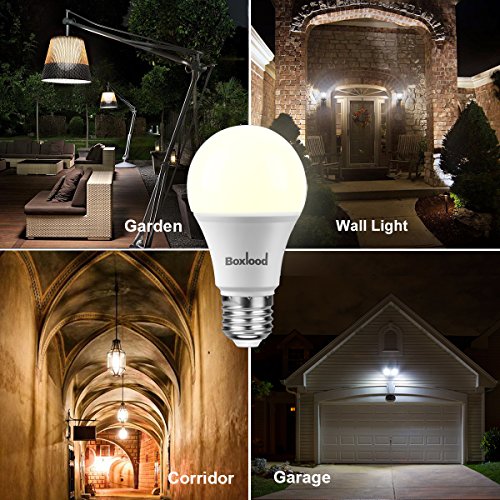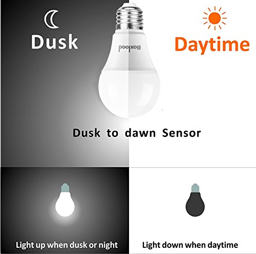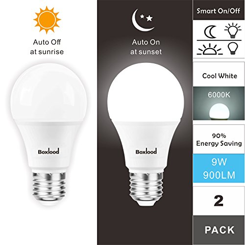 Boxlood Dusk to Dawn A19 LED Light Bulb, Built in Light Sensor, Plug and Play, 90% Energy Saving, 6000K Cool White, 90W Halogen Equivalent, E26, AC120V, Auto On/Off Lighting Bulb (2 Pack)