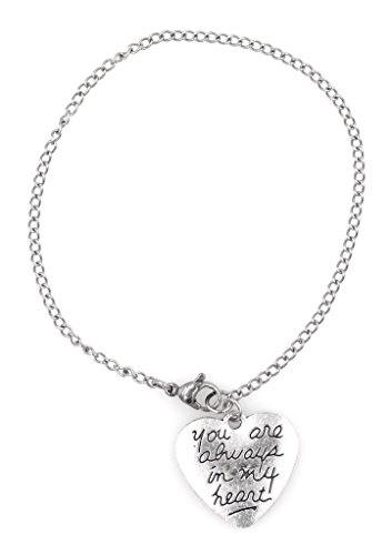 -. Binding : Jewelry -. Brand : It's All About...You! -. Department : womens -. EAN : 0740175296623 -. Feature : Quantity: One (7.5" + 2" Stainless Steel Extender Chain) 316 Stainless Steel Bracelet with Attached Alloy Charm. Perfect size for girls and women. Adjustable from 7.5" to 9.5". / Bracelet is made with quality 316 Stainless Steel. Hypoallergenic, durable and corrosion resistant. Great for everyday wear with little maintenance required. / Packaged in an organza bag and placed in a white pillow box for easy, beautiful gift giving. Pillow box is shipped flat to prevent damage and will need to have the ends pushed in P.R.Ior to gifting. / Stainless Steel bracelet link dimensions: 3x2x0.5mm. / Charm Size: 20mm x 21mm -. Label : It's All About You Jewelry -. Manufacturer : It's All About You Jewelry -. PackageQuantity : 1 -. ProductGroup : Jewelry -. ProductTypeName : FASHIONNECKLACEBRACELETANKLET -. Publisher : It's All About You Jewelry -. Studio : It's All About You Jewelry -. Title : 7.5” - 9.5” 316 Stainless Steel You Are Always in My Heart Ankle Bracelet Anklet, 2mm Curb Chain. Packaged in an Organza Bag and Placed in a Pillow Gift Box -. UPC : 740175296623