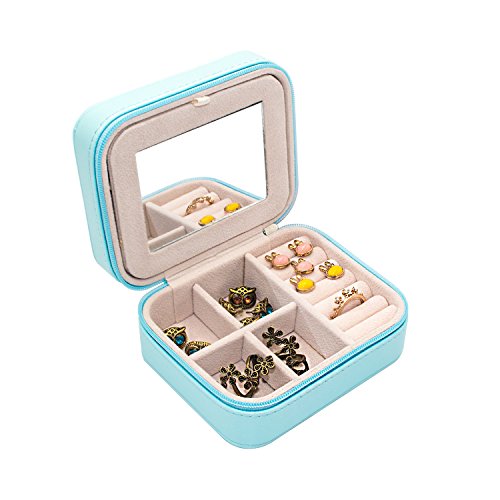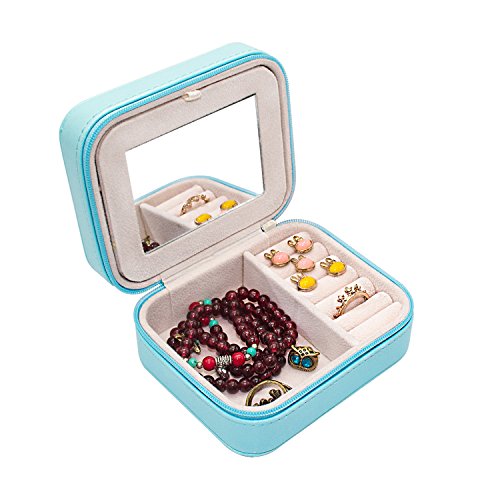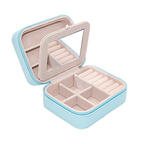 Small PU Leather Travel Jewelry Box Organizer with Mirror & Detachable slots (Blue)
