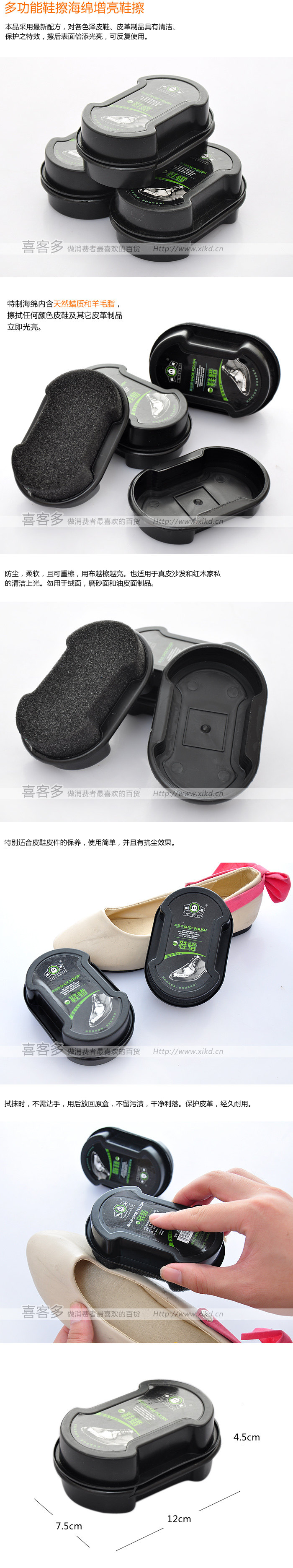 Introduction:Special sponge contains natural wax and lanolin, wipe any color shoes and other leather goods immediately light. Dustproof, soft, and can be re Sassafras, Sassafras, the brighter the cloth. Especially for leather shoes maintenance, simple to use, and have anti-dust effects.