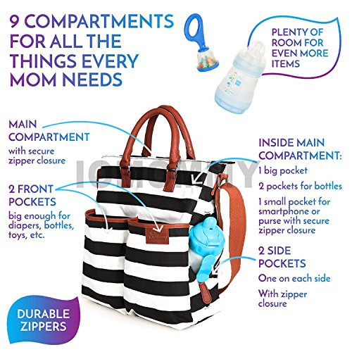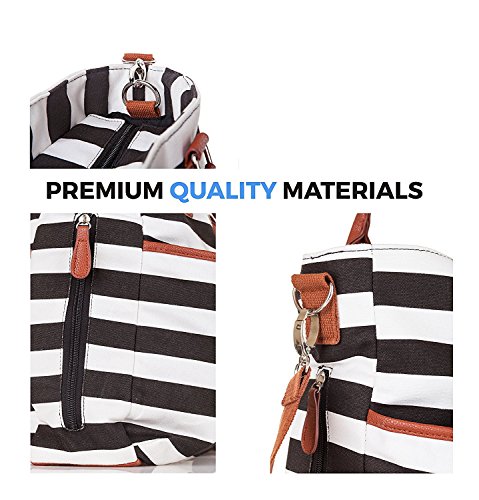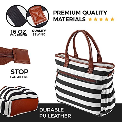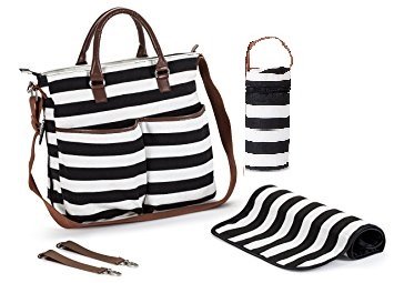 Woven from Rich & Premium organic & waterproof cotton canvas built to last. The competition only uses cheap porous canvas for their bags. Helps protect against spills and is easily wipe-able. This New diaper bag design provides practicality and space without compromising on the fashion aspect. Cute, tough and well assembled to handle a lot! SPACIOUS diaper bags !! This baby diaper bag has enough room to carry all of your essentials and more. 7 pockets including 1 main compartment with secure zipper closure, 2 side pockets, perfect for bottles and feeding items. 2 external pockets great for wet things and 2 internal compartments. With ADJUSTABLE shoulder straps and short handles carrying this with you on the go is a breeze! * Comes with a super cute matching changing mat (with WATERPROOF side material) included an insulated Bottle Holder * Can be used to carry things for children of all ages. Click the "ADD TO CART" button to take advantage of our * 3 week LIMITED TIME SPECIAL PRICING now! 100% Satisfaction Guaranteed!Feature