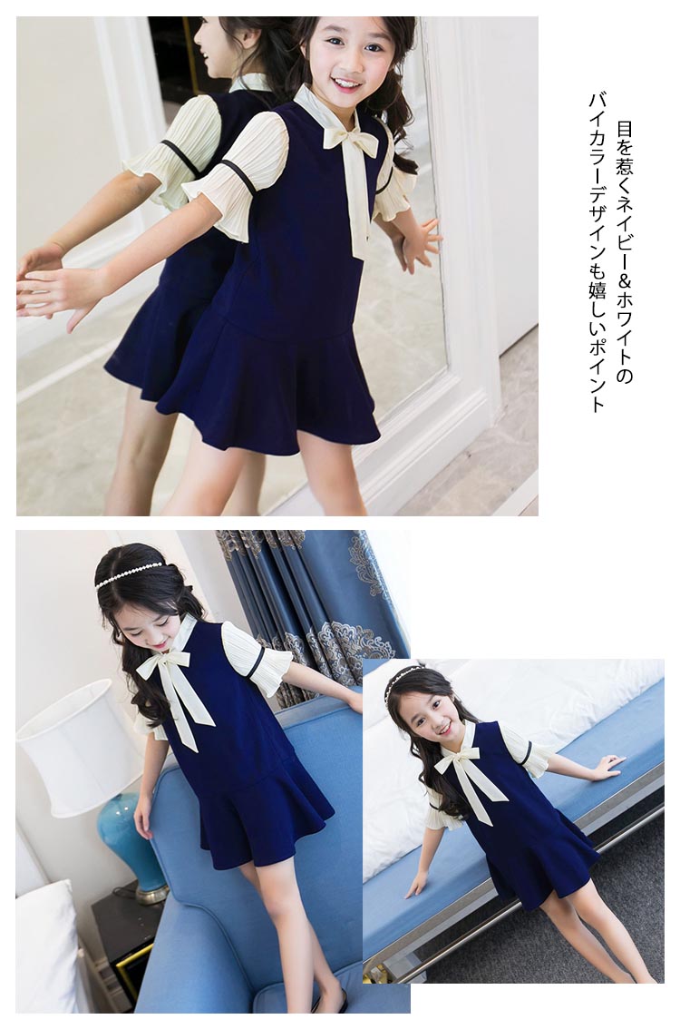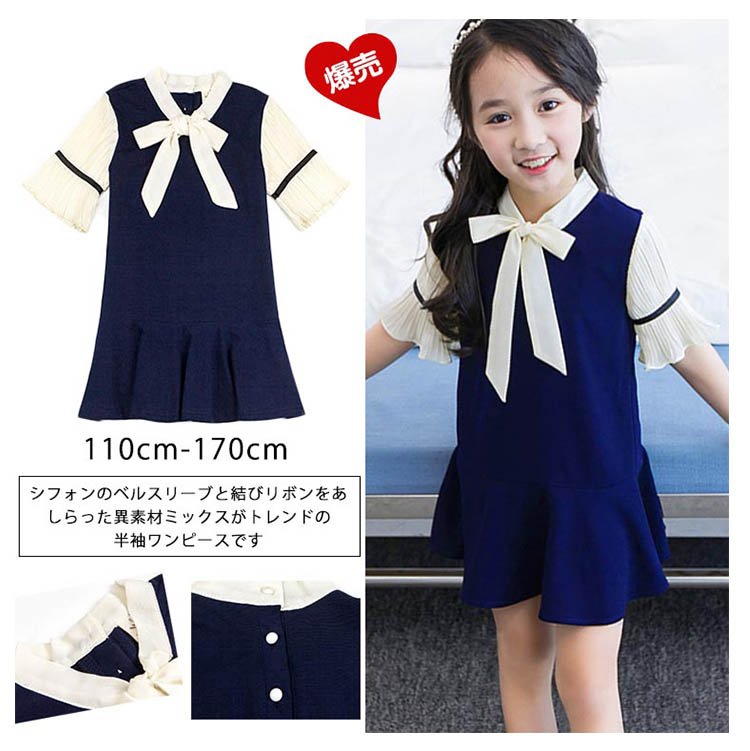 | シフォンのベルスリーブと結びリボンをあしらった異素材ミックスがトレンドの半袖ワンピースです本体はストレッチのある上品な素材Aラインで体型を選ばず、ラフな着心地◎目を惹くネイビー&ホワイトのバイカラーデザインも嬉しいポイントママサイズもご用意しているから、ママとお揃いで嬉しい | |