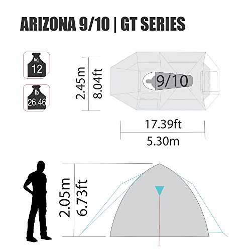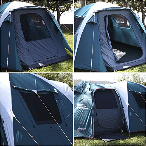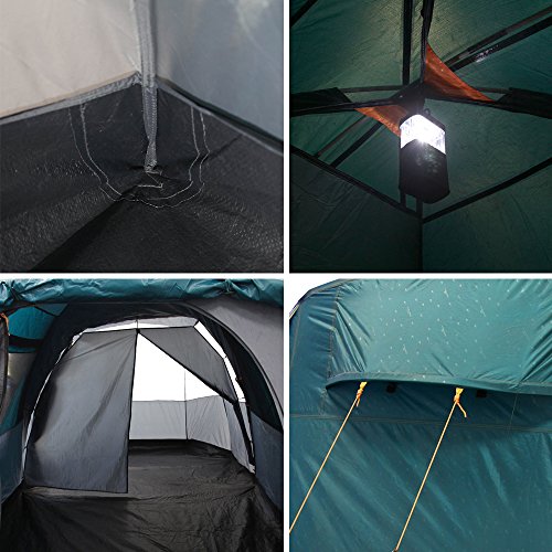 RATED No 6 FOR THE BEST FAMILY TENT IN THE USA IN 2016. SPACIOUS 9 to 10 Person (adults/kids), 2 Rooms, 2 Doors, 3 Windows Tent Designed for Easy Assembly with color coded poles. Super 6.2 FT height for maximum comfort. NEW 40 YEAR CELEBRATION PROMO ITEM INCLUDED: LED STORM STRETCH LIGHT WITH BATTERY VALUED AT USD 14.99