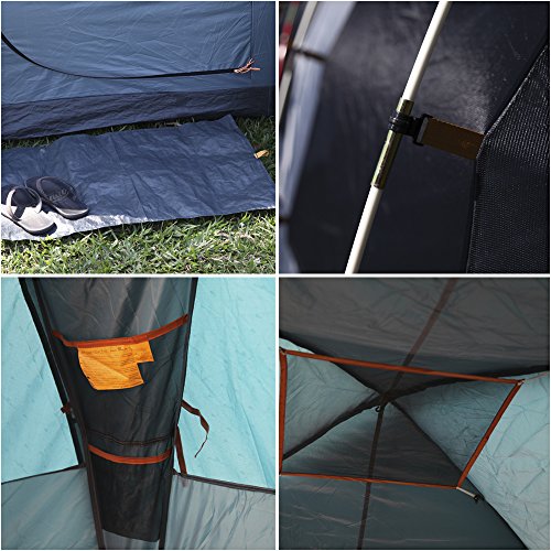 FULL COVERAGE RAINFLY: Double layer 190T polyester laminated with polyurethane 2500 mm water column, partially aluminum, heat-welded PU seam sealed and UV protection, Large covered mesh vents provide even more ventilation. Inner tent: Large D-style doors with mosquito mesh for great views and ventilation. Roomy utility pockets and gear loft for gear storage.