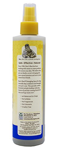 Burt’s Bee’s Detangling Spray for Dogs helps you groom your dog with gentle, natural ingredients that help keep your pup fresh naturally. Burt's Bees Detangling Spray is made with some of nature’s finest ingredients for your peace of mind and your canine’s well-being. Tap into nature’s power with this gentle spray made with lemon oil to reduce buildup and linseed oil to coat the fur. Burt’s Bee’s Detangling Spray for Dogs takes the stress away from brushing and keeps your pup happy and free of uncomfortable, matted fur.Feature