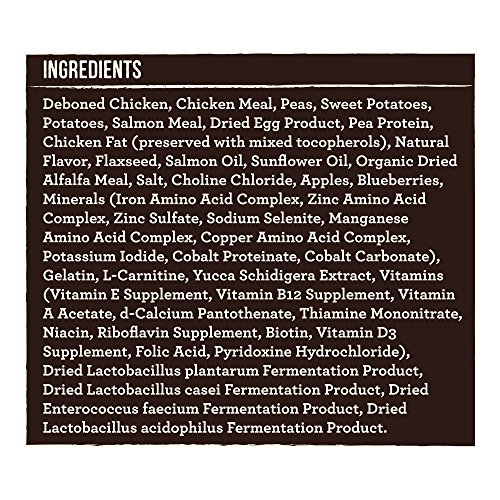 Kibble Recipe starts with real deboned chicken as the first ingredient accompanied by peas, sweet potatoes and potatoes