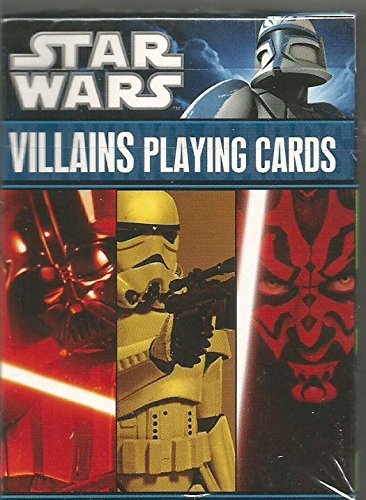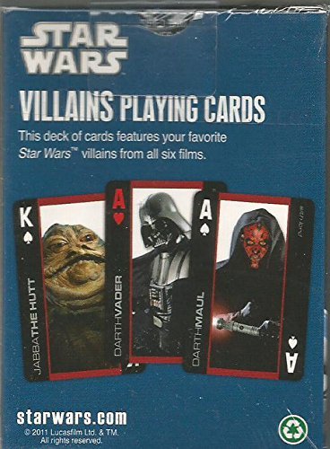This is for a full deck of Star Wars playing cards! Style: Villains (2011). This full deck of poker cards features your favorite Star Wars villains from the first 6 Star Wars films! Cards measure roughly 2.5" x 3.5" each and feature the picture of the Hero, his or her name, along with the standard poker card images (hearts, spades, diamonds, clover) and letter or number in the upper and lower corners! Perfect for any Star Wars card playing fan!