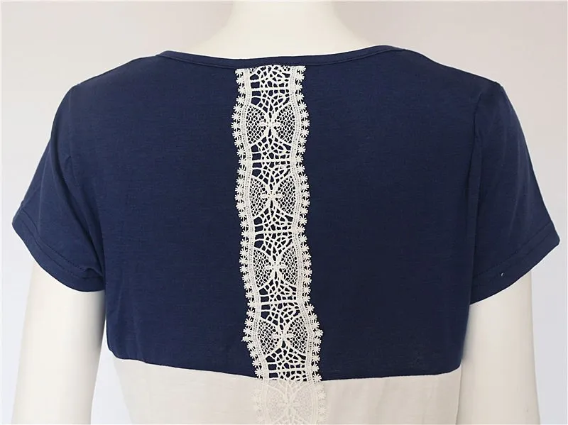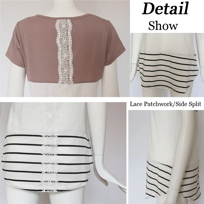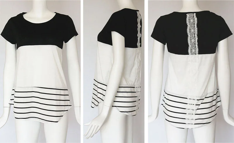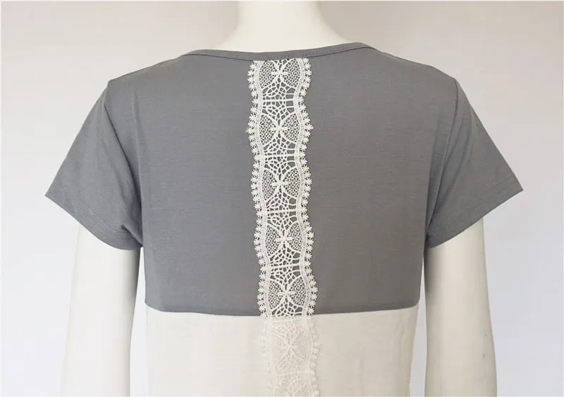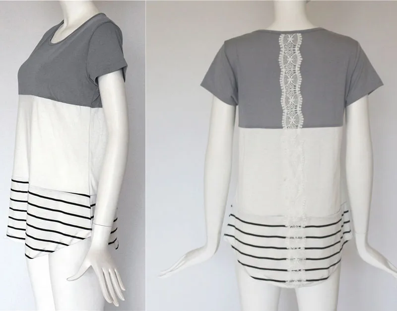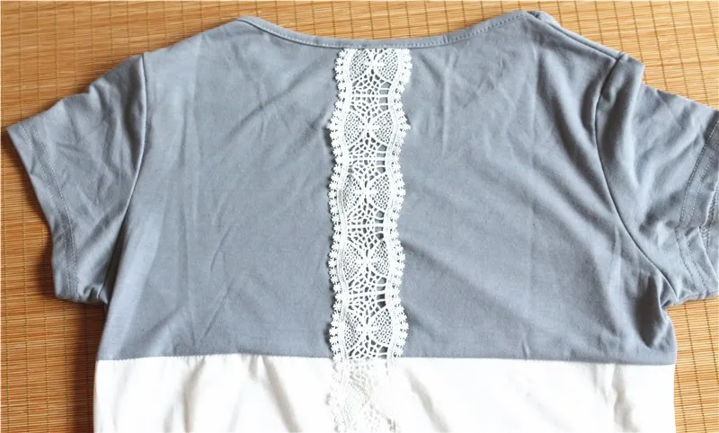 Design:Irregular Hem Color Block Back Lace stitching Long T Shirt