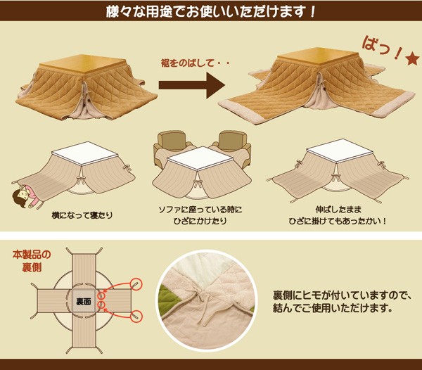 こたつで寝てしまうという方にピッタリ、タレ部分が伸びるタイプのこたつ布団です。表地にはソフトは肌感触と保温性に優れた起毛生地を使用しています。裏地にはあたたかいシープ調の生地を使用しています。省スペースタイプで角が膨らまず、お部屋を広く使えます。部分暖房のコタツは電気代もおトクです。