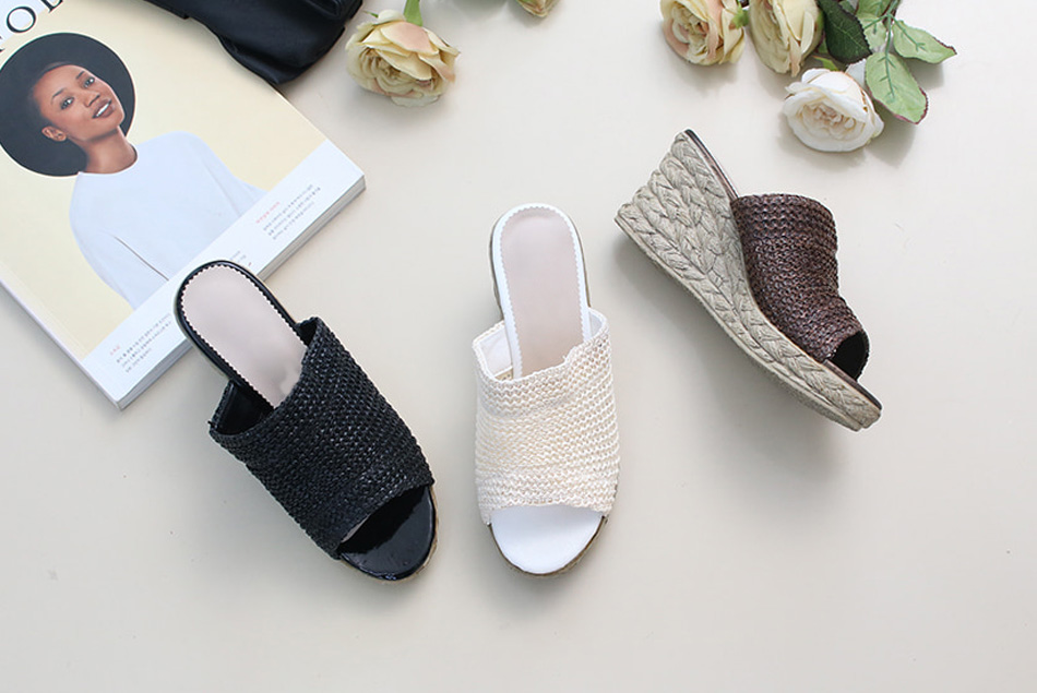 시원한 느낌의 발등의 라탄소재와 굽라인에 에스파드류 디테일로 내추럴한 느낌을 더했습니다