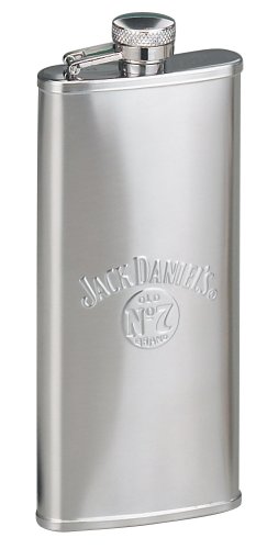 Jack Daniel's Stainless Steel Boot Flask. The embossed Jack Daniel's swing logo and Old No. 7 brand bug logo appear on the front and a twist off stainless steel captive top is permanently attached to the flask for loss prevention.