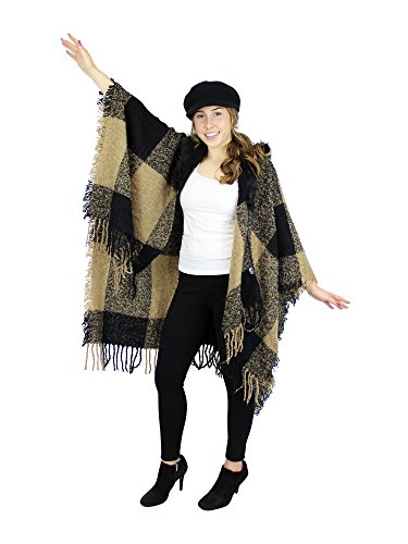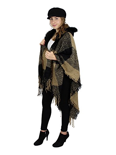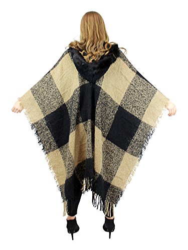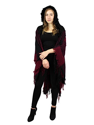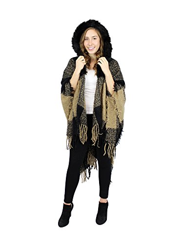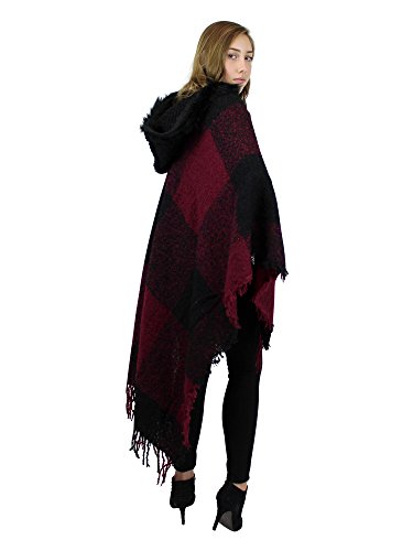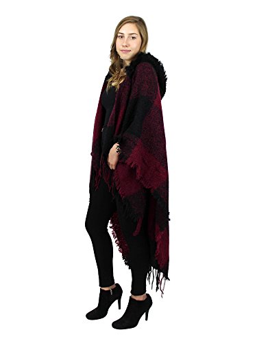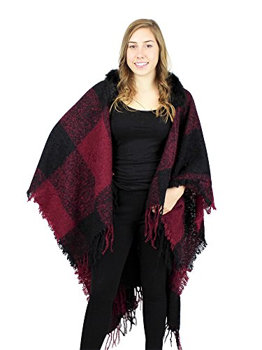 Made of soft woven acrylic, this large wrap has a knitted hood with faux fur trim, stylish tassels, and chic checkered pattern. One size fits most.
