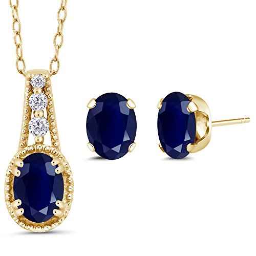 -. Binding : Jewelry -. Brand : Gem Stone King -. Color : Blue and White -. Department : womens -. Feature : SIMPLY SOPHISTICATED - This delicate pendant will immediately put you in the spot light. Crafted with high quality stones this pendant is the perfect accessory for any ensemble on any occasion. Our complimentary 18" Chain makes sure that this piece is stunning and all around flattering. / UNIQUELY DESIGNED- With simplicity in mind this pendant is the perfect item for gift givers who want to show they care. Perfect for birthdays, weddings, mother day or just those moments when you want to get something for that "Someone Special". / GORGEOUS- and Sparkly these unique earrings are perfect for any outfit! Pair them with date night and work week looks you cannot go wrong! Beautifully crafted these earrings are the perfect gift for any occasion and make perfect stocking stuffers for the holidays. They're truly a fashion staple and belong in every jewelry collection. / UNIQUE- The design of these earrings will ensure that you stand out effortlessly. Gift these beautiful earrings to yourself or someone you love. Made in the USA Gem Stone King products are always made with the highest quality elements and standards. / Gemstones may have been treated to improve their appearance or durability and may require special care. -. Model : GCC-0221-OV-S-dBL-S-dBL-T-W-YG14K -. MPN : GCC-0221-OV-S-dBL-S-dBL-T-W-YG14K -. NumberOfItems : 1 -. PackageQuantity : 1 -. PartNumber : GCC-0221-OV-S-dBL-S-dBL-T-W-YG14K -. ProductGroup : Jewelry -. ProductTypeName : FINENECKLACEBRACELETANKLET -. Title : 2.20 Ct Oval Blue Sapphire 14K Yellow Gold Pendant Earrings Set With 18" Chain