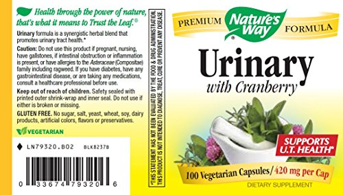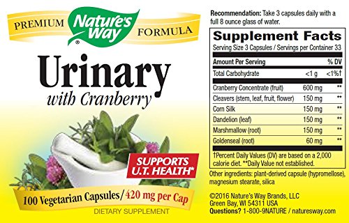 Studio : Nature's Way Publisher : Nature's Way Binding : Health and Beauty Product Description Nature's Way Urinary Formula is an advanced dietary supplement representing the powerful synergy of current science and traditional herbal medicine. Urinary by Nature's Way includes 600 mg of cranberry concentrate, 180 mg of dandelion leaf, 180 mg of marshmallow root, 180 mg of cleavers, 150 mg of corn silk, and 60 mg of goldenseal root.Urinary formula uses concentrated cranberry fruit, to maintain a healthy urinary tract. Dandelion leaf, traditionally used for supporting regular urination. Goldenseal root, a popular herb containing berberine, and often recommended for urinary tract health, and herbs Marshmallow Root and Corn Silk, historically used to soothe the urinary tract 0