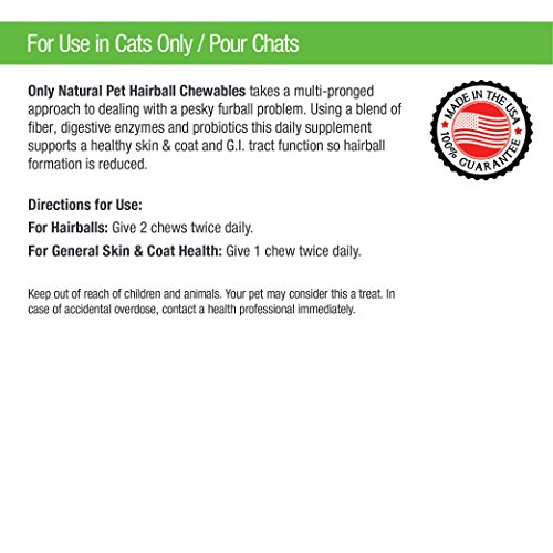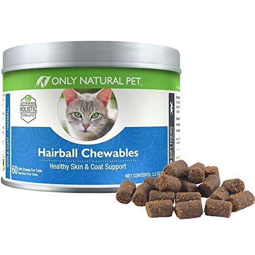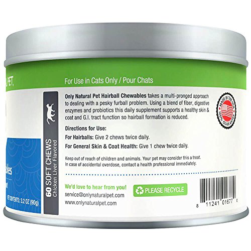 -. Binding : Misc. -. Brand : Only Natural Pet -. Feature : SUPPORTS HEALTHY DIGESTION - Only Natural Pet's hairball remedy for cats is a perfect addition to your cat's natural diet with ample nutrients to support skin and digestive health. Include daily brushing with our soft chews for the best results. / A TASTY "TREAT" CATS LOVE - These chicken liver flavored soft chews also provide extra roughage to help your cat's body eliminate existing hairballs and support healthy skin and coat to help reduce formation of hairballs. / INCLUDES PROBIOTICS & DIGESTIVE ENZYMES - These work to support your cat's digestion, resulting in proper nutrient absorption and a healthy skin & coat. Probiotics will keep your cat's GI system functioning properly, allowing for fewer hairballs. / MADE FROM ONLY NATURAL INGREDIENTS - We never use any laxatives or lubricants. Petroleum based hairball treatments can be toxic to some cats and may have negative effects on the immune system. Made in the USA in an FDA approved facility. / SATISFACTION GUARANTEE - Only Natural Pet products always include a 100% Satisfaction Guarantee. Only Natural Pet uses only the highest quality ingredients in our products. Providing you & your pet the highest quality products is our top P.R.Iority. -. Label : Only Natural Pet -. Manufacturer : Only Natural Pet -. MPN : mp-999200.2 -. NumberOfItems : 1 -. PackageQuantity : 1 -. PartNumber : mp-999200.2 -. ProductGroup : Pet Products -. ProductTypeName : PET_SUPPLIES -. Publisher : Only Natural Pet -. Size : 60 Soft Chews -. Studio : Only Natural Pet -. Title : Only Natural Pet Hairball Remedy For Cats - Helps Control Hairball Formation And Shedding In Healthy Feline Cats - 60 Soft Chews