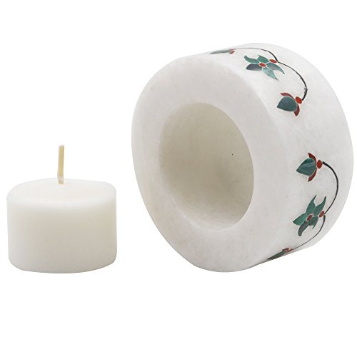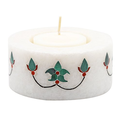 Reevaria Pietra dura Marble Candle Stand - Tealight Round - Handcrafted Design and Inlaid with pure natural and Semi Precious Stones - Perfect Christmas Gift