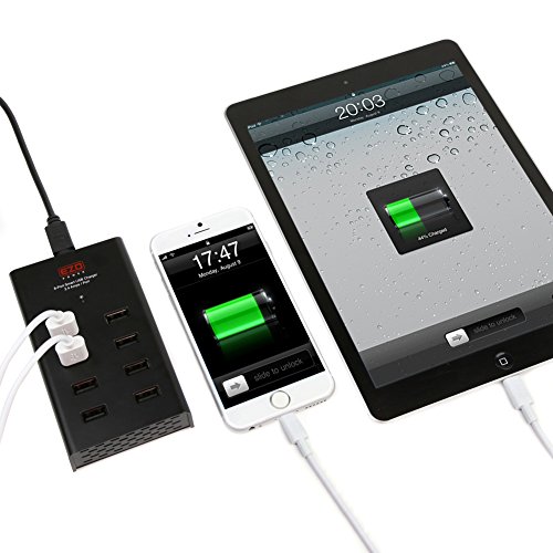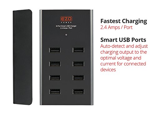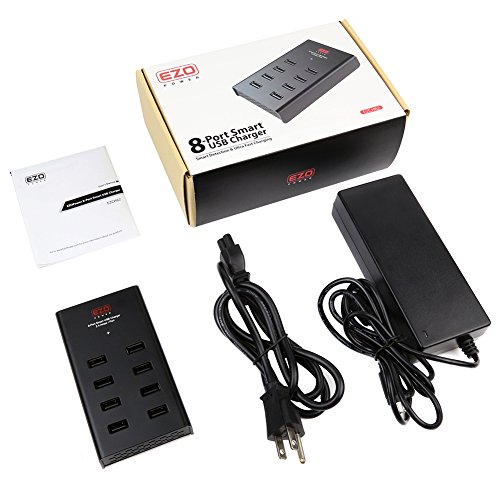 - Feature : Highest Power Output on the Market at 96 Watts / 19.2 Amps Total Output. / 8 USB Ports (5V/2.4A Each) Allow Convenient Charging of Multiple Devices at Once without Loss of Charging Speed. Blue LED Indicator Light Indicates Full Protection / The Featured Smart USB Ports Auto Detect Connected Devices and Self-Adjust Charging Output to the Optimal Voltage and Current to Avoid any Compatibility Issue while Charging at Full Power / High Quality Heat-Resistant Enclosure with Full Protection Against Overcurrent (OCP), Overvoltage (OVP) and Short Circuit / Package Content: EZOPower 8-Port Smart USB Charger, 9.5ft Power Cord, Instruction Manual, One Year Hassle Free Warranty