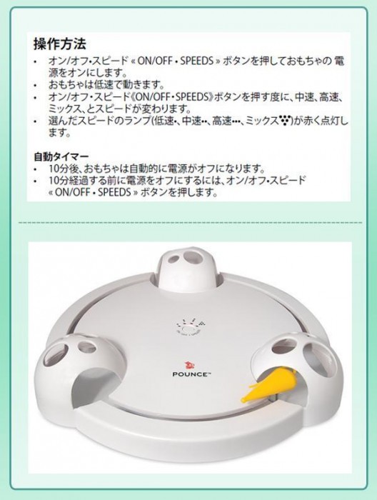 円形トラックを電動ネズミが前進したり後進したり、隠れたり、小刻みに動きます。ランダムなネズミの動きで猫ちゃんの狩猟本能を刺激。4段階のスピード設定(低速、中速、高速、ミックス)が可能。 |