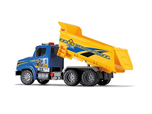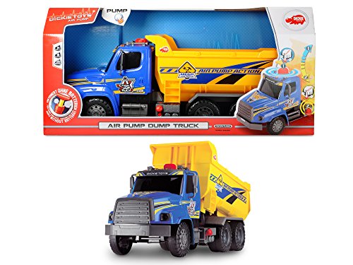 Air Pump Dump Truck: the monster machine! Come to us for innovative toys with lots of features and meticulous attention to detail. Discover lots of imaginative play worlds. No load is too big: measuring an incredible 21', the Air Pump Dump Truck from Dickie Toys creates a big first impression. Based on Freightliner vehicles, the truck has been carefully designed with superb attention to detail. A particular feature is the pneumatically operated tipper body. It can be tipped up and lowered by pressing a knob or operating a lever - just like on a real building site. This innovative principle means that the construction vehicle doesn't need any batteries. So Dickie Toys is contributing towards sustainable play and learning: at the end of the day children want to know exactly how this air pump system works. Be inspired by driving fun and our amazing ideas.Feature
