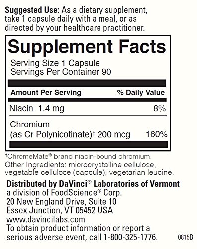 -. Feature : A Chromium Polynicotinate supplement to support proper glucose and cholesterol functions.* Supplementing with Chromium can help the body to build lean muscle mass, maintain glucose and cholesterol levels within normal ranges, and metabolize fat more efficiently.* / STRENGTH IN EXPERIENCE: For over 40 years, DaVinci Laboratories has been a leader in nutritional research, product development and innovation from its home state of Vermont. DaVinci Laboratories is a family-owned and managed company. Every day, DaVinci continues to set new standards for quality and product innovation so they can keep you as healthy and informed as possible. / STRENGTH IN NATURE: The raw materials used in DaVinci products are as natural as possible and are guaranteed to contain no artificial flavorings, preservatives, colors, sweeteners or other foreign agents unless otherwise stated on the label. / STRENGTH IN INTEGRITY: DaVinci Laboratories is one of the few companies to offer you truth in labeling. Pledging total truth in labeling means the DaVinci family of products contain only the purest and most potent ingredients. Guaranteed. / STRENGTH IN RESEARCH: DaVinci Laboratories' research focuses on the complex relationships that exist among nutrients and the latest advancements in nutritional therapies to develop and produce some of the most significant products available. The Research and Development Department is under the direction of a Ph.D. Nutritional Biochemist.