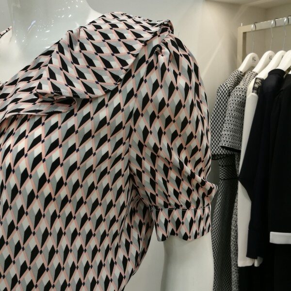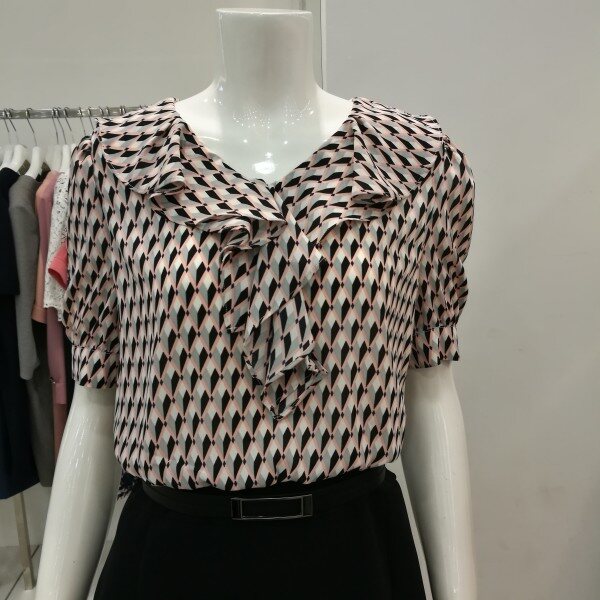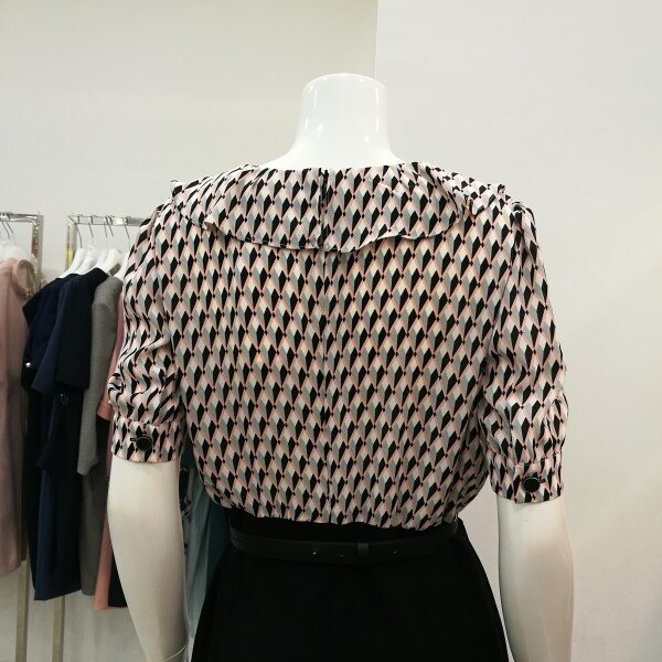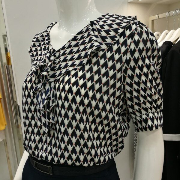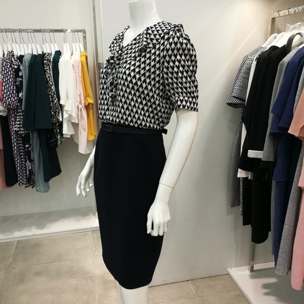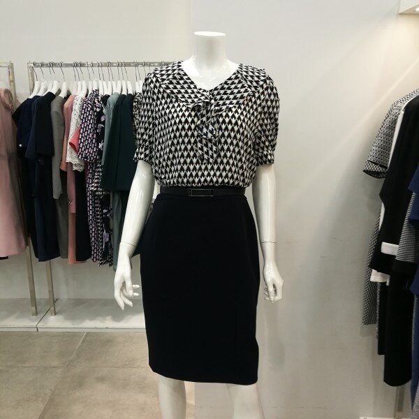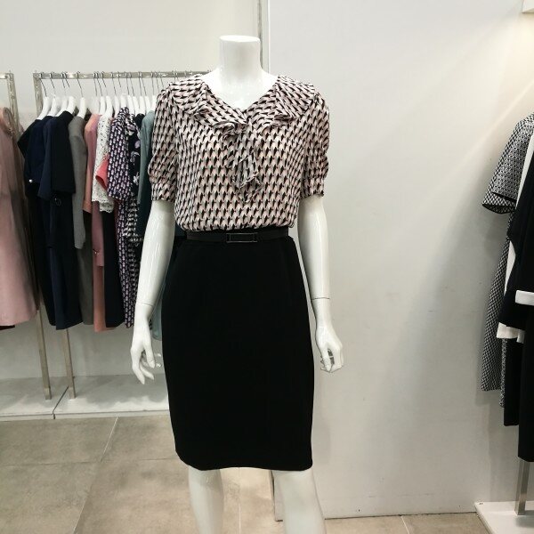 도형블라우스에 기본스커트 꼭 투피스 입은 스타일로서 여성스럽고세련되고 고급스럽다. 블라우스는쉬폰소재로 시원하고 가볍고 하늘 거리는 느낌으로 단아하다.