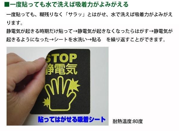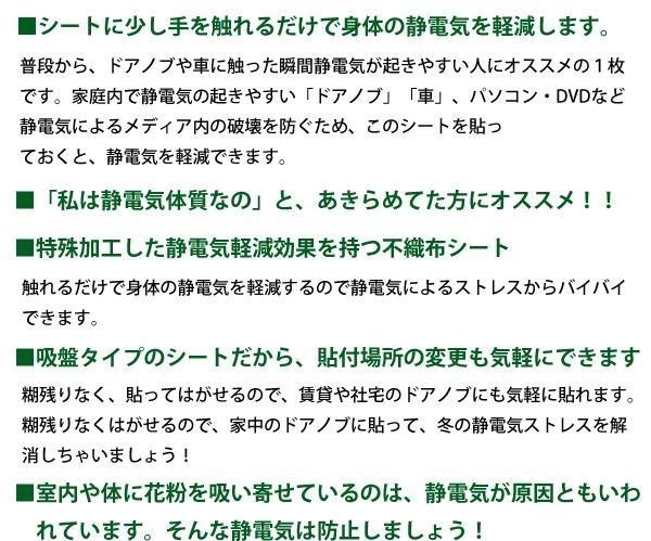 | 糊残りなく貼ってはがせるから、気軽に貼れます。普段から、ドアノブや車に触った瞬間静電気が起きやすい人にオススメの1枚です。家庭内で静電気の起きやすい「ドアノブ」「車」、パソコン・DVDなど静電気によるメディア内のデータ破壊を防ぐためにこのシートを貼っておくと、静電気を軽減できます。 |