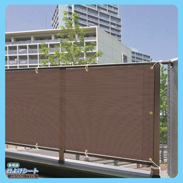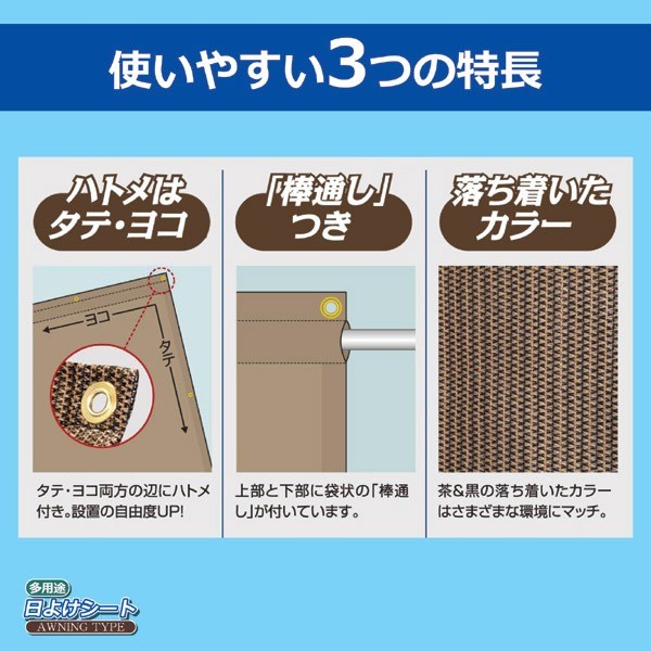強い日差しのあるシーズンに欠かせないシート日よけです。窓からの日光をカットしてくれるので、家具や畳などの日焼け防止や冷房効率を上げる効果もあります。日よけとしてだけでなく、ベランダ柵に取り付ける目隠しとしても使えます。オーニングタイプなので景観をイメージダウンさせることはありません。固定の仕方は多用途で、シート周囲に多数配置されたヒモ固定用のハトメを使っての設置に加え、市販の突っ張り棒などを通して吊るした設置方法も選べます。屋外だけでなく、室内のカーテン側に取り付けることもオススメです。
