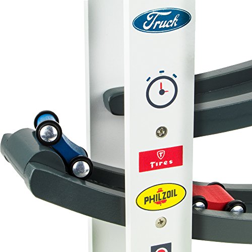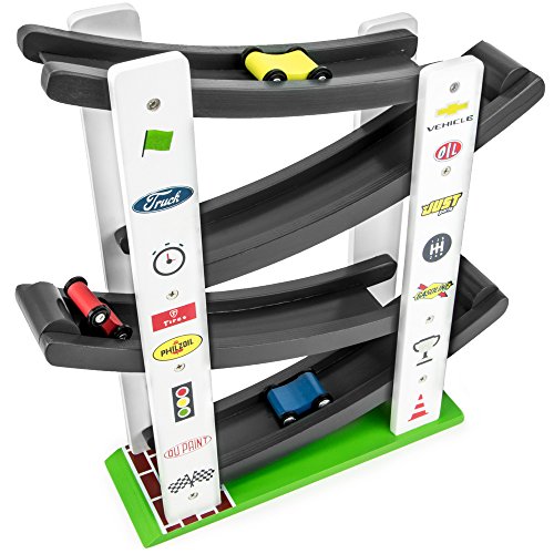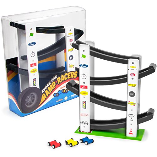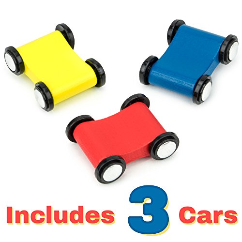 START YOUR ENGINES: Place your wooden cars at the start and watch them zig-zag down the track toward the brickyard finish line! Includes 3 cars and 1 pre-built race ramp