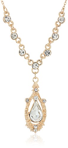 Gold tone Y necklace featuring clear crystal pear-shape stone with clear crystal accents