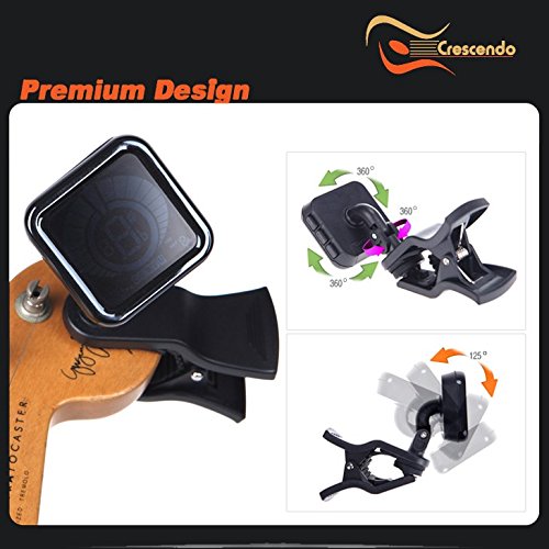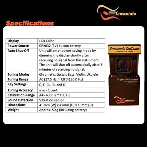 FEATURES- Automatic shut-off, 360 degree rotation, front or rear headstock position, sturdy clamp w/ soft silicone rubber to protect your axe. Multiple tuning keys for tuning your B-flat or E-flat horn or orchestra instrument. Battery included. Full 3-year warranty!