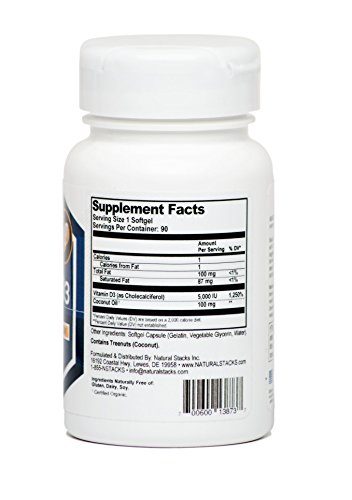 -. Binding : Health and Beauty -. Brand : Natural Stacks -. EAN : 0700600138737 -. Feature : 5,000 IU OF VITAMIN D3 PER SOFT GEL - HIGHLY BIOAVAILABLE FORM OF NATURAL VITAMIN D (CHOLECALCIFEROL) / ENHANCES MOOD AND COGNITIVE ABILITY BY FIGHTING VITAMIN D DEFICIENCY / OPTIMAL ABSORPTION THROUGH CERTIFIED ORGANIC COCONUT OIL (100 MG PER SERVING) / NO GMOs, NO GLUTEN, NO ARTIFICIAL COLORS, NO PRESERVATIVES / PROUDLY MADE IN THE USA -. IsAdultProduct : 0 -. Label : Natural Stacks -. Manufacturer : Natural Stacks -. MPN : FR-CY60-NS01 -. PackageQuantity : 1 -. PartNumber : FR-CY60-NS01 -. ProductGroup : Health and Beauty -. ProductTypeName : HEALTH_PERSONAL_CARE -. Publisher : Natural Stacks -. Studio : Natural Stacks -. Title : Vitamin D3 5000 IU Capsules with Organic Coconut Oil - Maximum Potency - Optimal Absorption - 90 Softgels - Highly Bioavailable Form of Natural Vitamin D - Three Month Supply -. UPC : 700600138737
