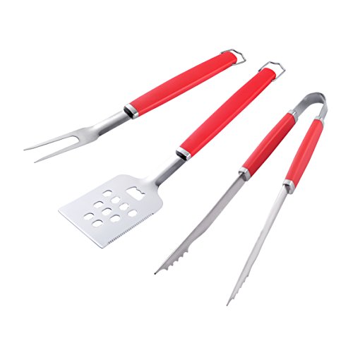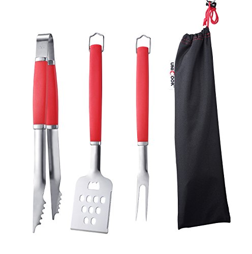 Unicook Classic Stainless Steel 3-Piece BBQ Tool Set with Storage Bag, Red Color Easy to Grip Handle, Including Multi-Function Spatula,Tongs,Fork and Storage Bag, Easy Cooking and Clean Up