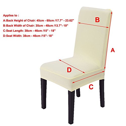 -. Feature : Soft , comfortable and wrinkle resistant,no ironing required; / Stretch design that recovers quickly,secure fit with sewn-in elastic hem; / Suitable for Chair Size:Back Height:45-60CM/17.7"-23.6";Back Width:35-48CM/13.8"-18.9";Seat Length 38-46CM/15"-18.1";Seat Width:38-46CM/15"-18.1"; / Very easy to cleaning and wash, machine washable; / Fit for Hotel,wedding banquet, dinner, meeting, celebration, ceremony, family dining room decoration, etc.;