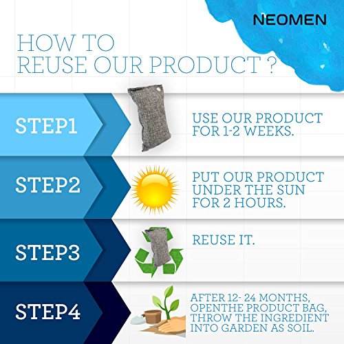 - √ REUSABLE: To rejuvenate and re-activate place the bags outside in the sun once a month for about an hour. The service life is much longer than activated charcoal.