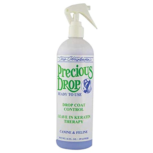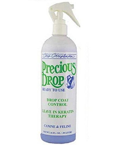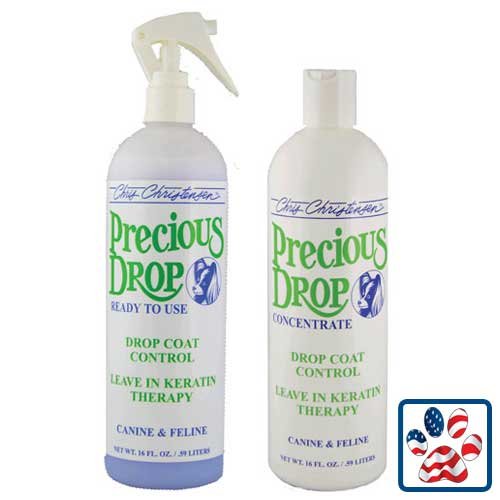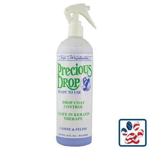 Chris Christensen's Precious Drop is a blend of keratin proteins and essential oils of lavender blossom. This non-oily spray won't separate the coat. Produces soft, silky, flowing coats, Imparts a brilliant sheen, Reduces frizz matting, Eliminates breakage. 16 OZ 0