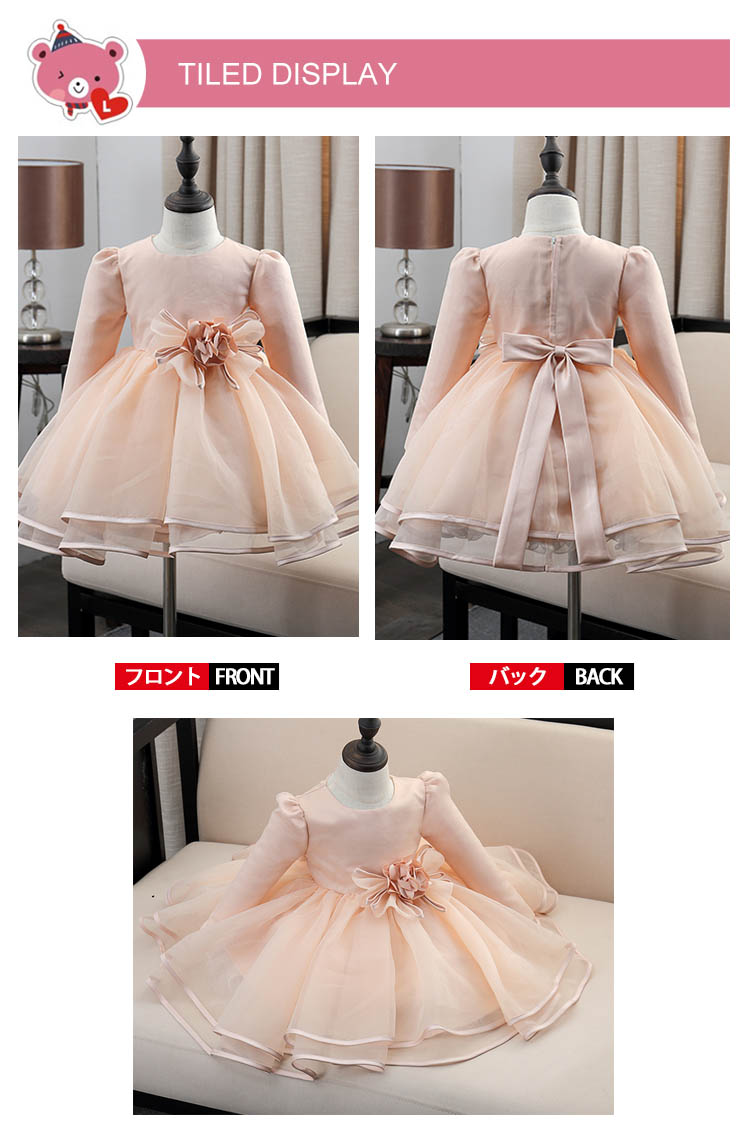 90 バスト55 ウェスト53 スカート着丈46 袖丈32100 バスト58 ウェスト56 スカート着丈51 袖丈34110 バスト61 ウェスト59 スカート着丈56 袖丈36120 バスト64 ウェスト62 スカート着丈61 袖丈38130 バスト67 ウェスト65 スカート着丈66 袖丈41140 バスト70 ウェスト68 スカート着丈71 袖丈43150 バスト73 ウェスト71 スカート着丈76 袖丈45単位:cm※上記サイズは平置き実寸になります。サイズ表の実寸法は商品によって1-3cm程度の誤差がある場合がございます。