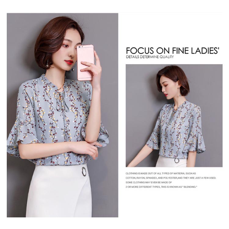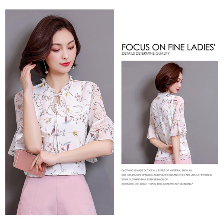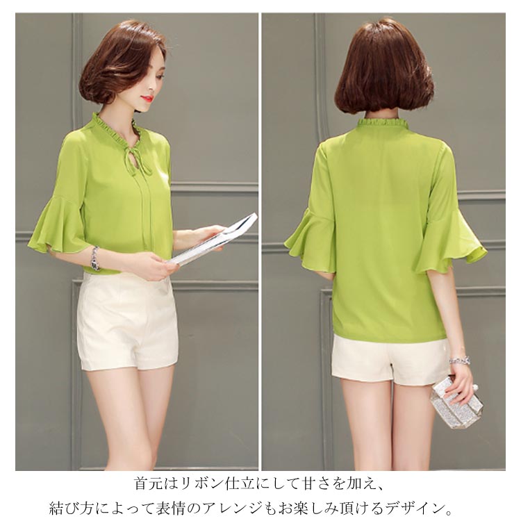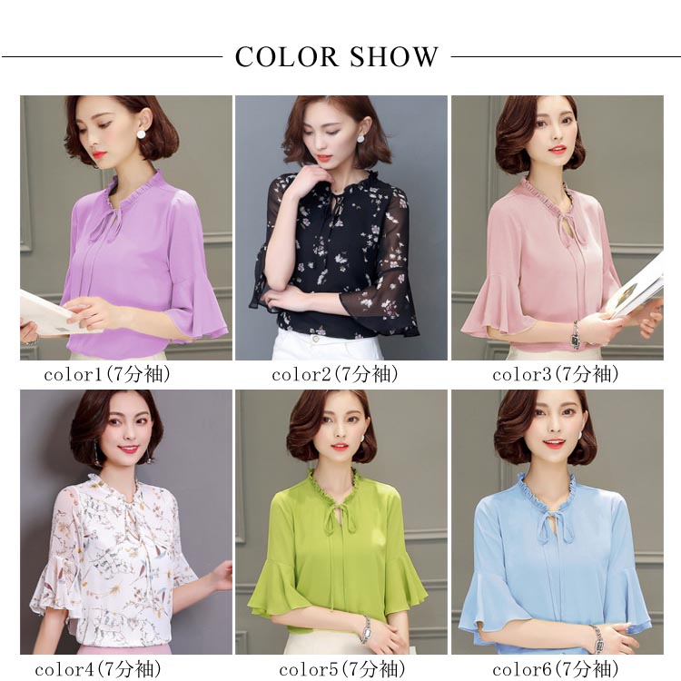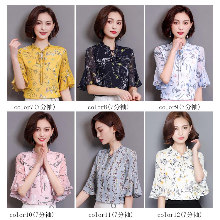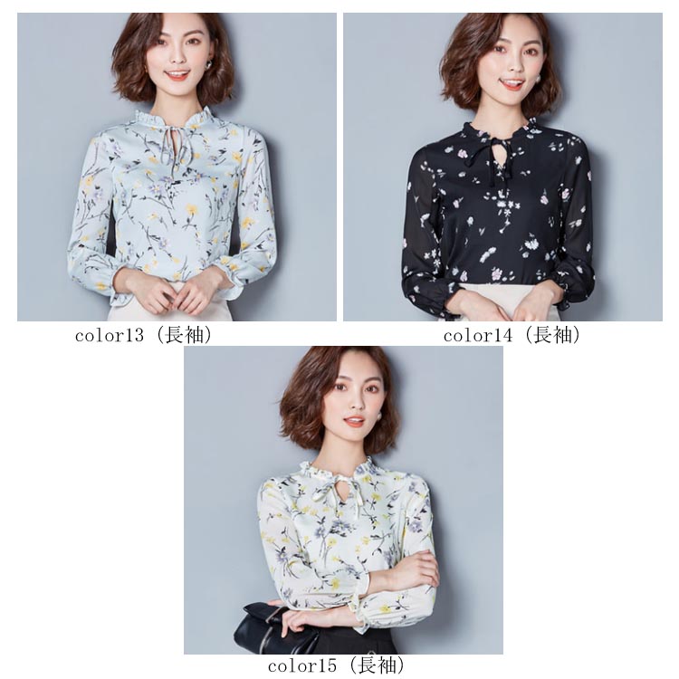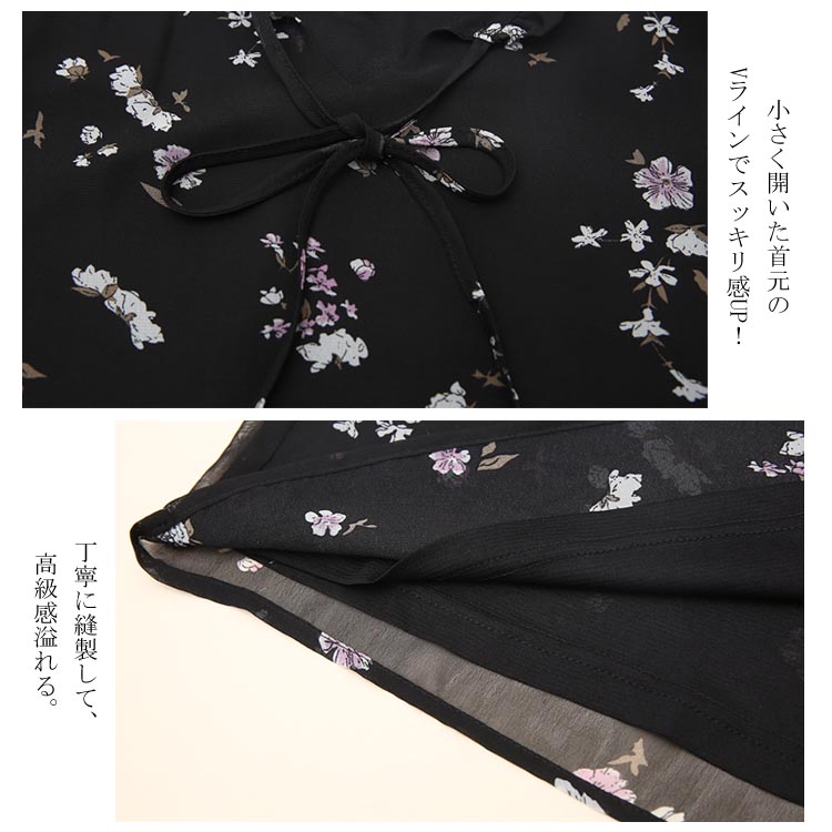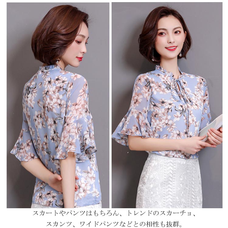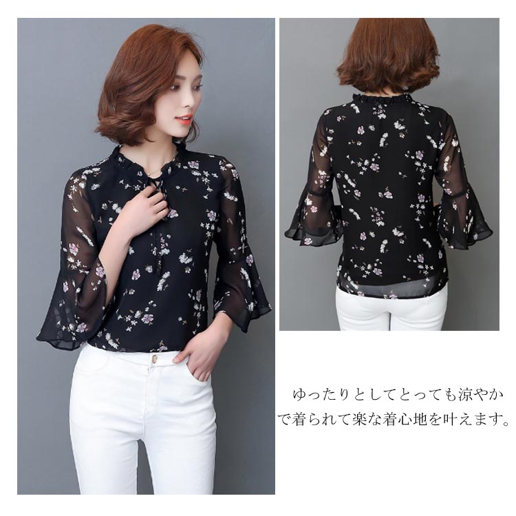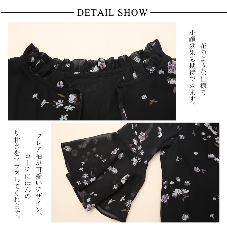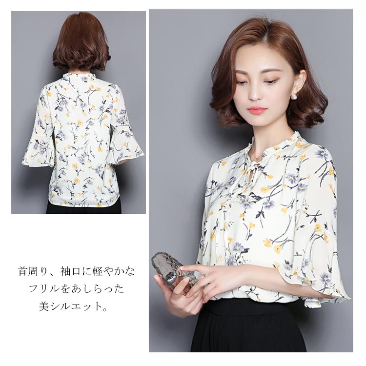 | 大人っぽい花柄と軽やかな袖女性らしいブラウス!ゆったりとしてとっても涼やかで着られて楽な着心地を叶えます。首周り、袖口に軽やかなフリルをあしらった美シルエット。首元はリボン仕立にして甘さを加え、結び方によって表情のアレンジもお楽しみ頂けるデザイン。 スカートやパンツはもちろん、トレンドのスカーチョ、スカンツ、ワイドパンツなどとの相性も抜群。 | |