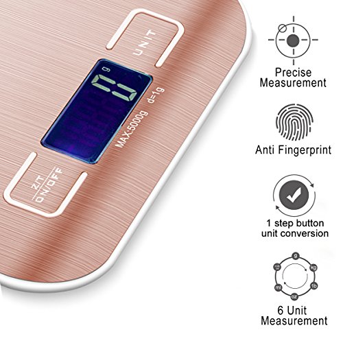 - ✅ACCURATE WEIGHTING —— Designed with four high-precise sensors to ensure fast and accurate weighting. Get the weight instantly and weight accurately from 1g/0.002lb to 5000g/11lb.High precision strain gauge sensors that deliver trustworthy results when you weight fruit/food/meat/flour/seasoning etc.