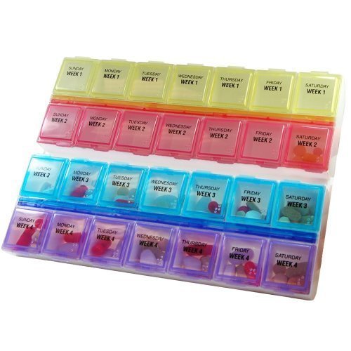 Studio : Apothecary Products Publisher : Apothecary Products Binding : Health and Beauty Product Description Allows Medication to be scheduled corresponding to the week of the month Organize all your medications for an entire month at one time. Convenient, time saving unit ends confusion of which pills to take throughout the day. Ideal for home or travel with large wells and easy to read labeling for each day. Plastic Approx. Dimensions: 8" L X 6" W X 1.5" D Each compartment is about 1x1x1 organizer is top rack dishwasher safe Each compartment holds 25 aspirin tablets. 1 compartment per day format for 4 weeks/28 Days Labeled Sunday Week1", Monday Week1", Tuesday Week 1" etc. for 4 weeks. Braille markings included. Entire lid pops off for cleaning. Reviews 0