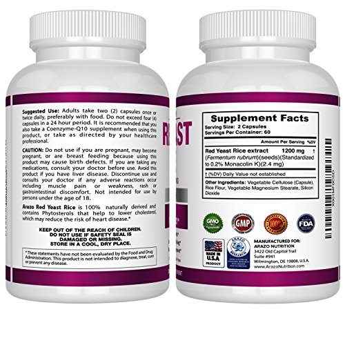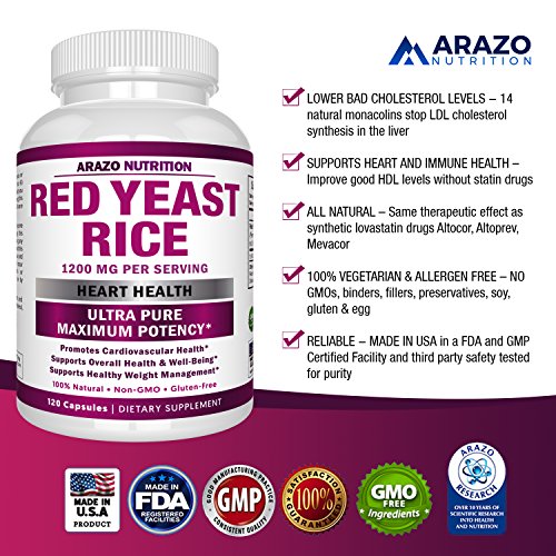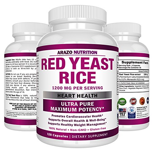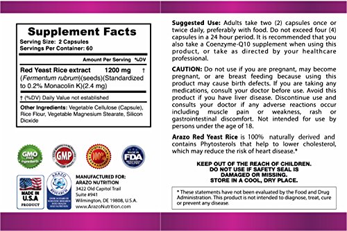 -. Title : Red Yeast Rice Extract 1200 mg – CITRININ FREE Supplement – Vegetarian 120 Capsules - Arazo Nutrition