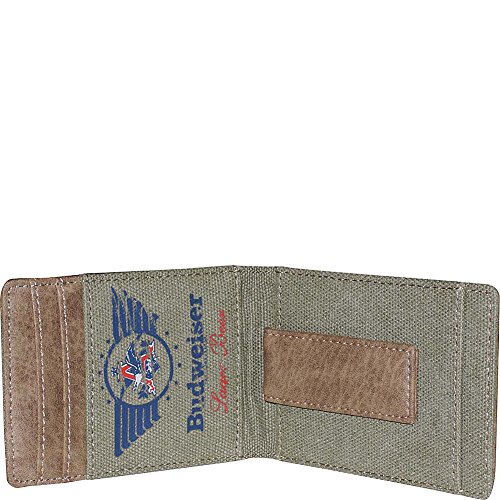 Studio : Budweiser by Buxton Publisher : Budweiser by Buxton Binding : Apparel Product Description Canvas exterior/distressed faux leather trim, signature budweiser lining eagle wings slim fold with clip features an outside i.D. Window, 4 credit card pockets and a magnetic money clip. 0