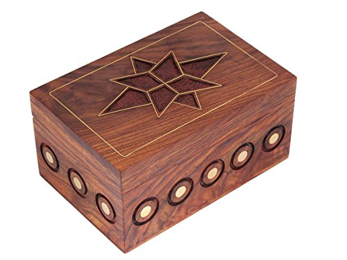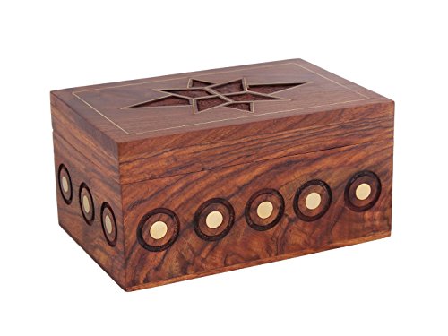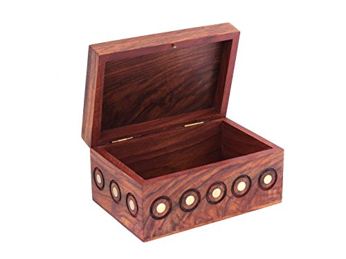 This extremely beautiful box is hand-crafted from strong and durable Indian rosewood with brass wire inlay and brass coin inlaid on all four sides of the box.