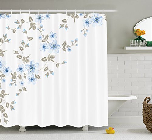 Light Blue Shower Curtain by Ambesonne, Japanese Sakura Cherry Tree Branches Framework Asian Spring Nature, Fabric Bathroom Decor Set with Hooks, 84 Inches Extra Long, Light Blue Grey White