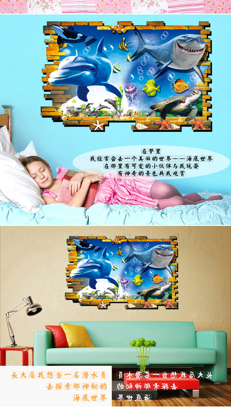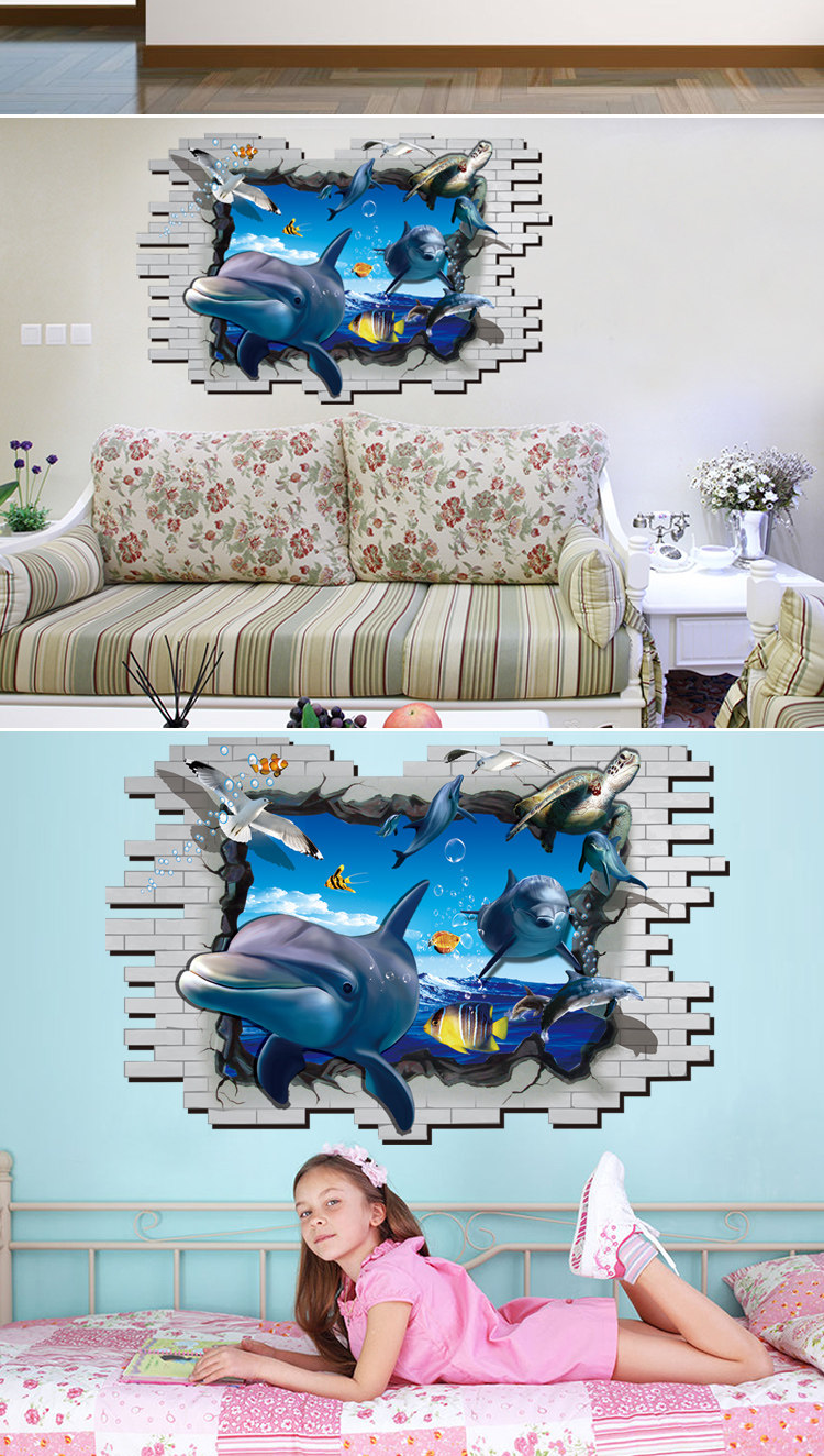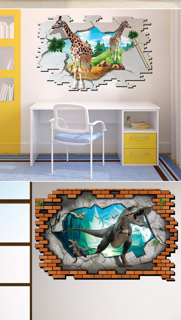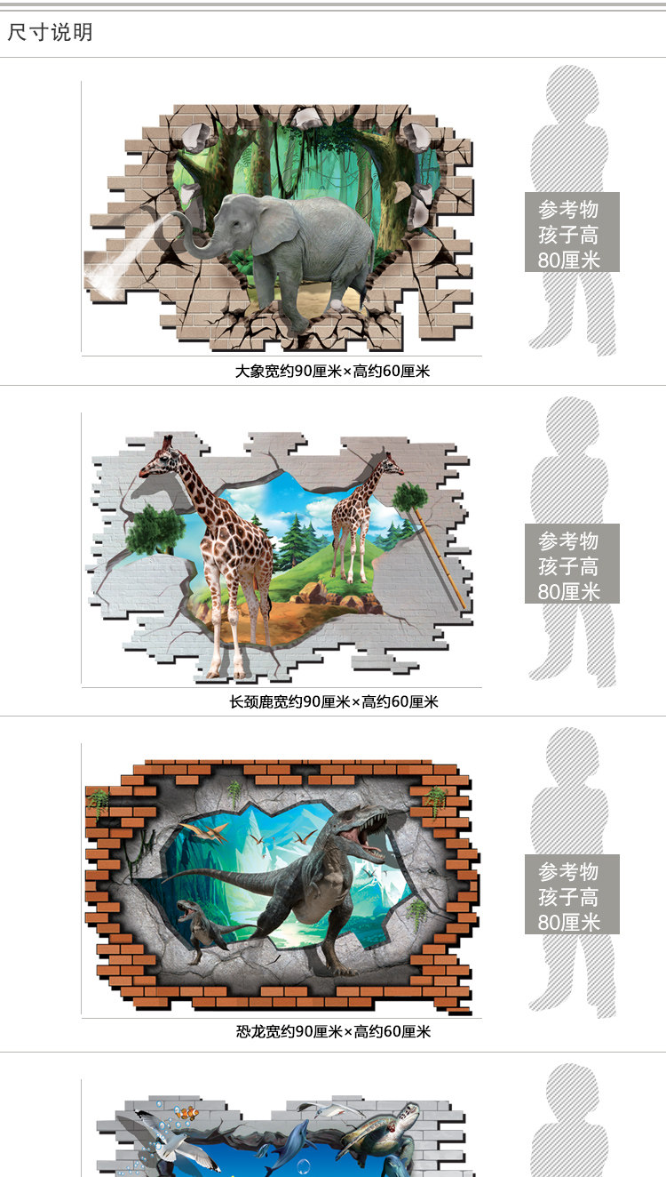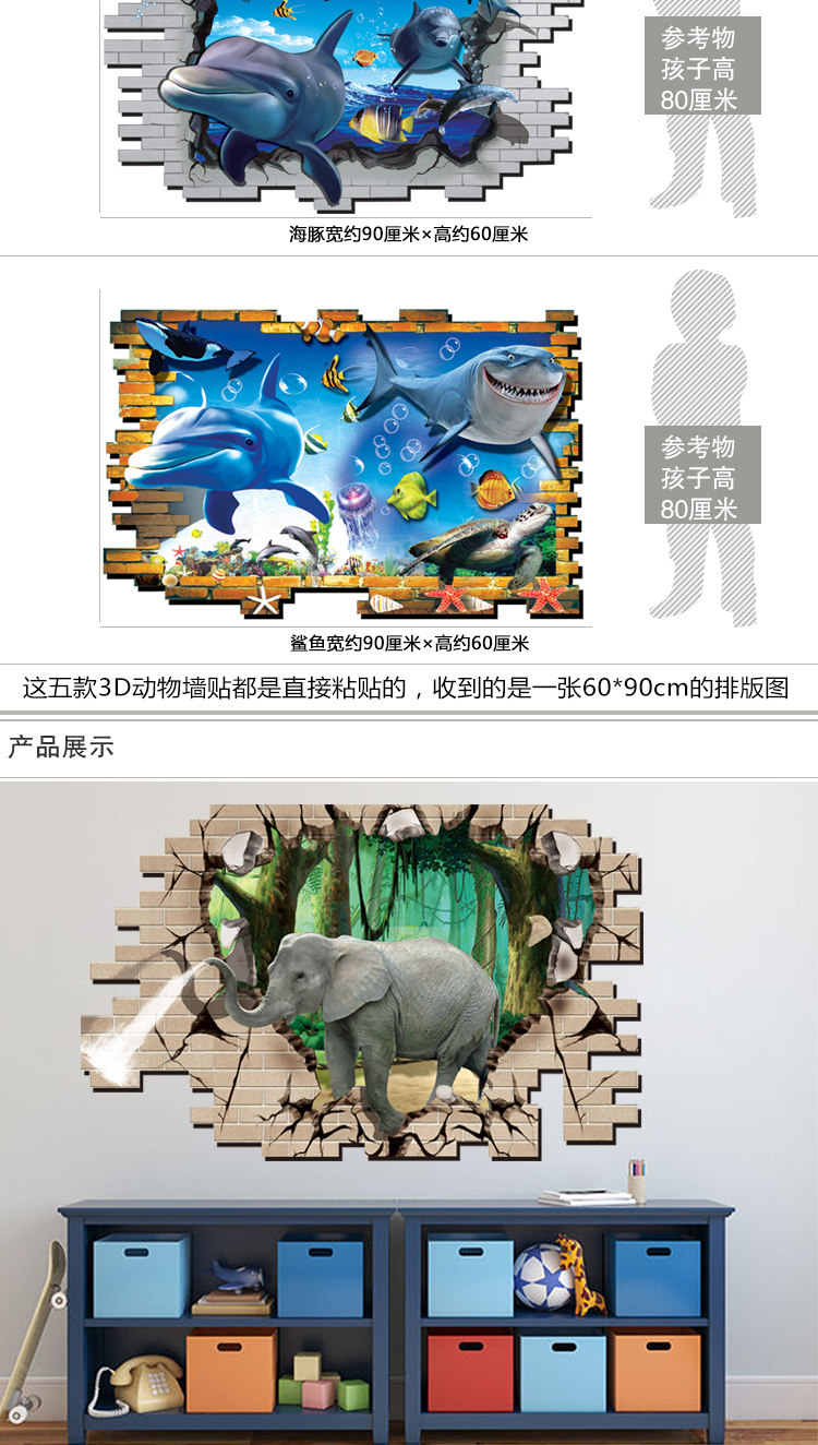 3D效果创意可爱海洋卡通动物大象长颈鹿儿童房浴室瓷砖防水墙贴纸