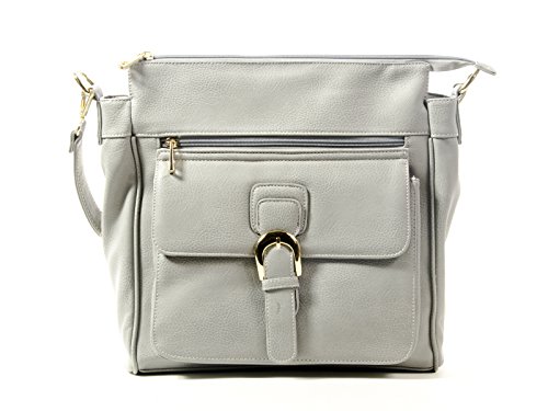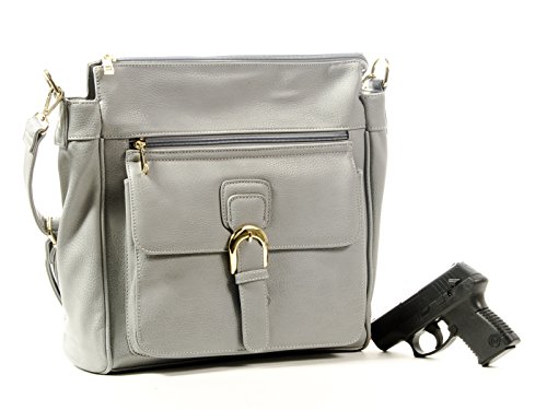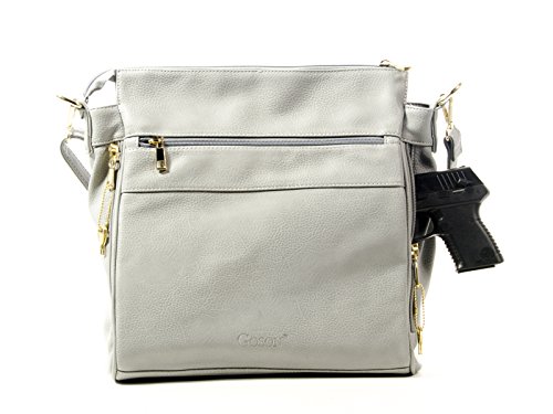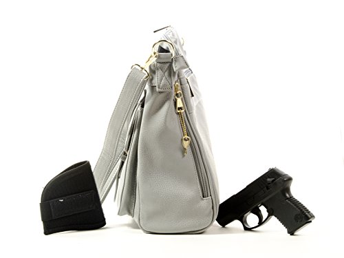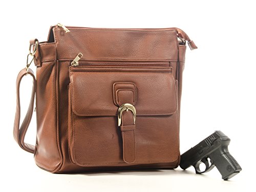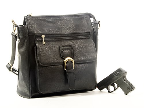 Not too big, not too small. This bag has it all! Made of PU leather it features lots of pockets, super stylish, and functions with either LEFT- or RIGHT HAND draw. This is a great everyday handbag. The front of the bag is dressed with a snap-close, Gold-tone buckle with 8 slots for credit cards and ID. It also has separate zippered pocket directly above it for keys or small personal items. Your cell phone has its own compartment located on the side with elastic sides for and top Velcro flap closure for the perfect fit. The back of the bag conceales your weapon and features LEFT AND RIGHT HAND padded, CCW compartment. Gun compartment is 9" x 7" ** and should easily conceal a medium size auto .380, .38 or subcompact 9mm in the horizontal position and is held securely in place with a nylon adjustable fit-all holster. The back side of the bag also has a small zippered pocket for misc small items. The interior compartment has two main compartments that is divided by a large zippered compartment. One of the main pockets has small zippered compartment for lipsticks, etc. The comfortable shoulder strap adjusts from a secure, under-arm carry of **14 inches to a full cross-body carry of approximately 26 inches. The overall size of the bag is 11" x 10" x 3 ½". ** All measurements are close approximate.Feature