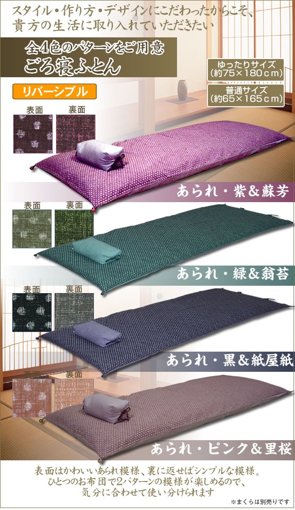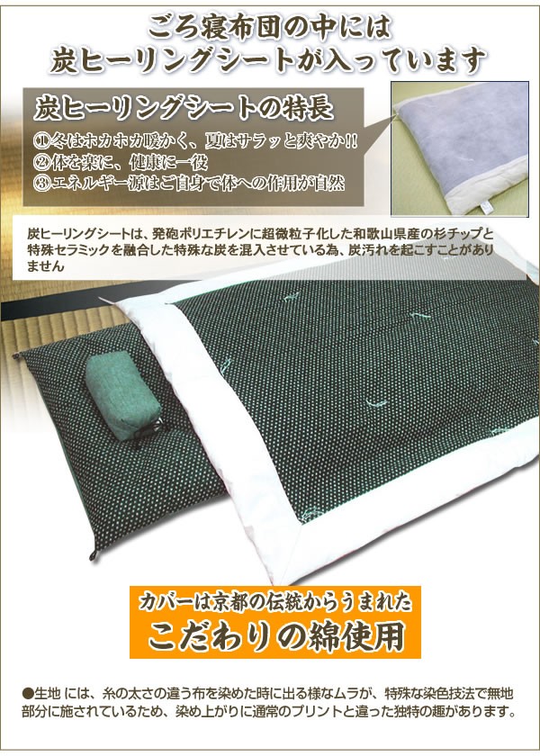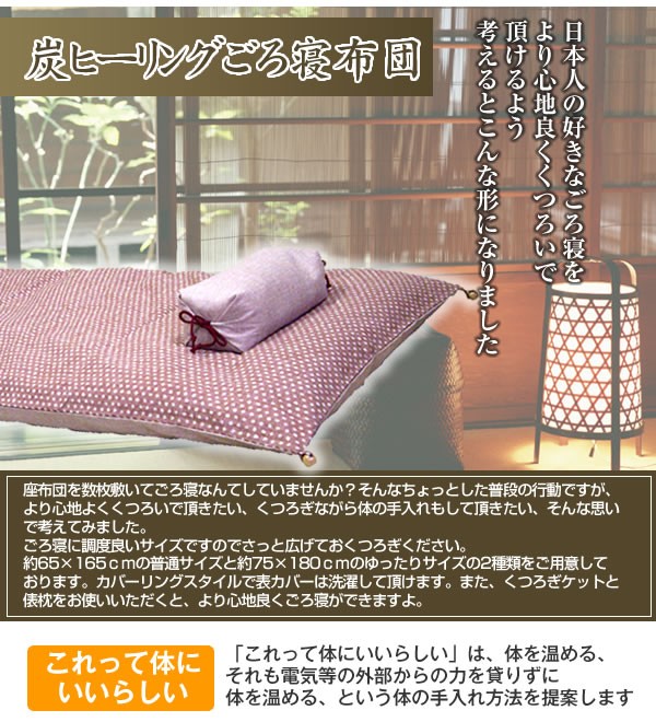 日本人の好きなごろ寝をもっと上質のくつろぎ時間に変えたい、そう思い作りました。炭ヒーリングの遠赤パワーでほかほかと気持ちよくうたた寝を。京都の伝統からうまれたこだわりの綿を使用しており、肌触りはやさしく手放せない一枚に。日本製 ※サプライヤー直送品【商品名】炭ヒーリングごろ寝布団 普通サイズ あられ・黒No.24&紙屋紙No.030
